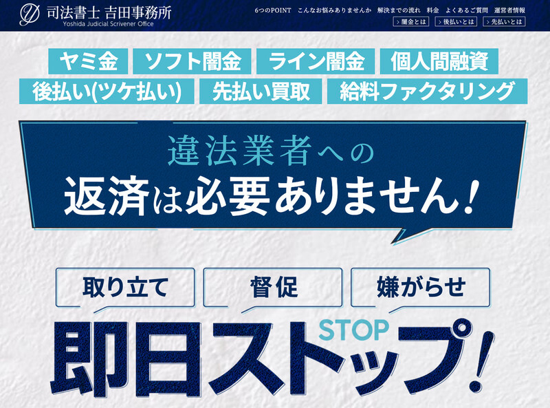 司法書士吉田事務所は、違法業者とのトラブル解決に特化した司法書士事務所で、闇金やソフト闇金など、さまざまな手口に幅広く対応しています。