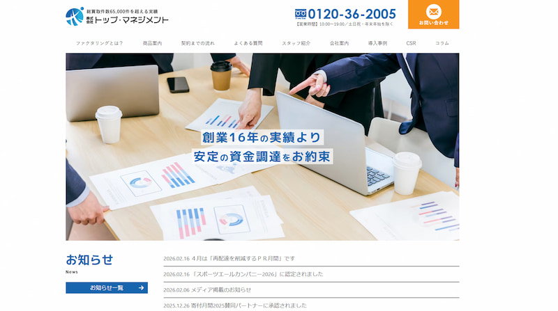 トップ・マネジメントは、創業16年・累計65,000社以上の支援実績を誇るファクタリング会社です。